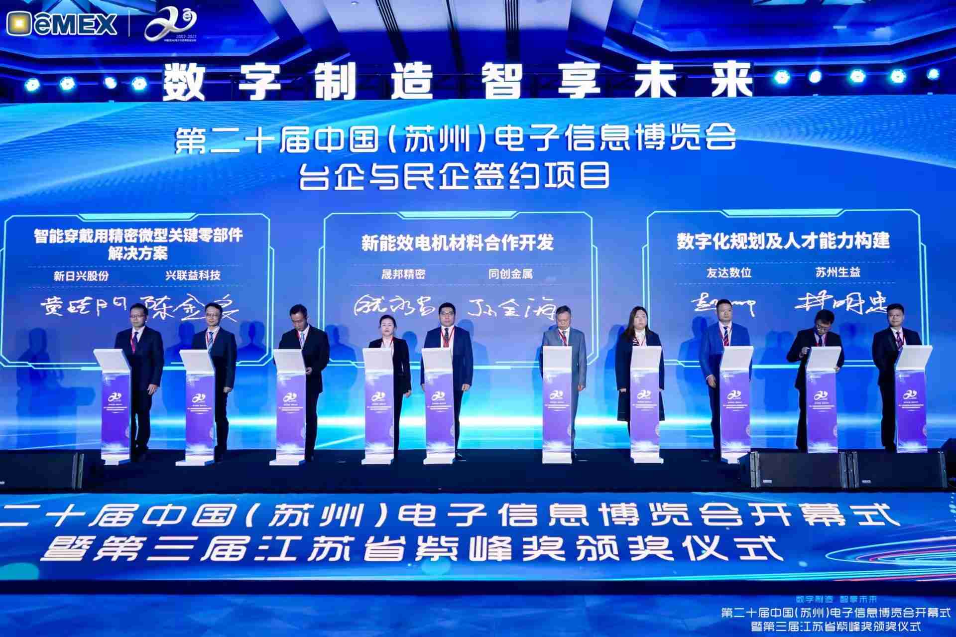 电博会开幕式当天也是第三届江苏省紫峰奖颁奖仪式,,,省台办、、工信厅、、商务厅、、苏州市相关领导均出席并颁奖。。。。该奖项为表彰对江苏高质量发展做出积极贡献的在苏企业,,,由江苏省政府专门设立。。彩神vll光电 (苏州) 总经理郭振明代表上台领奖,,这也是彩神vll苏州连续三次蝉联紫峰奖 出口贸易领军企业奖。。。。彩神vll数位总经理赵丽娜女士,,,也参与本次开幕式,,,上台为本地化赋能签署战略合作协议,,,,将优质服务资源集合、、、下沉到更多细分行业,,,,为更多地区的制造企业提供数字化转型服务。。。。